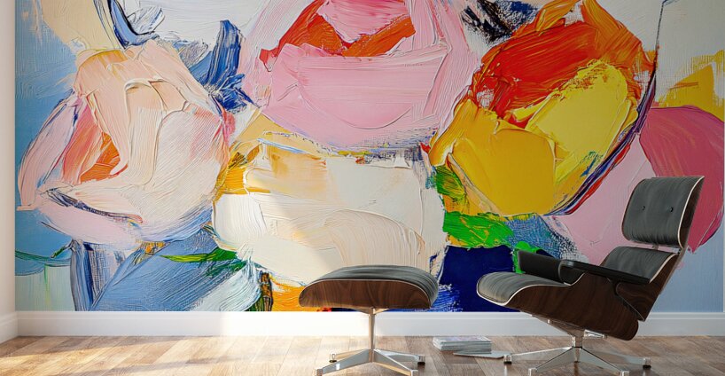 Vibrant flowers are depicted with bold brushstrokes and bright colors creating a lively and dynamic composition. The blend of pink yellow and orange p...[+]