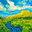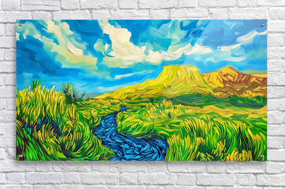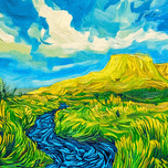 A vibrant landscape features a lively stream flowing through lush vegetation under a bright swirling sky. In the background a plateau dominates the sc...[+]