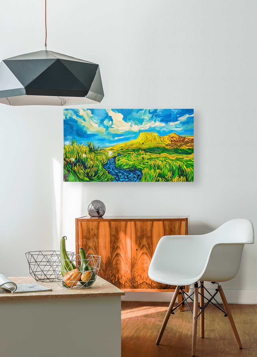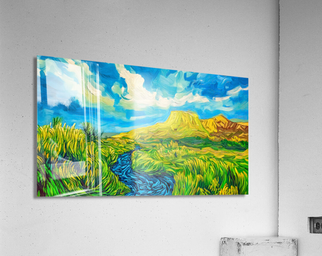 A vibrant landscape features a lively stream flowing through lush vegetation under a bright swirling sky. In the background a plateau dominates the scene with its bold yellow and orange hues.