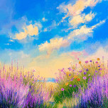 A vibrant landscape showcases a field of blooming wildflowers beneath a bright blue sky with fluffy clouds. The scene exudes a sense of tranquility an...[+]