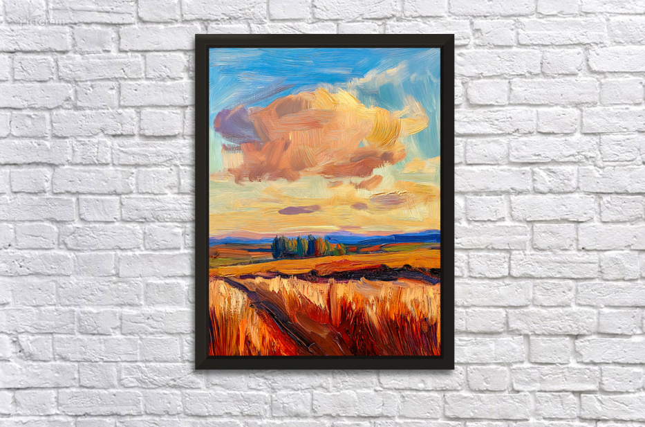 A vibrant landscape features a vast field under a sky filled with large textured clouds. The scene captures the golden hues of the terrain contrasted ...[+]