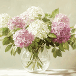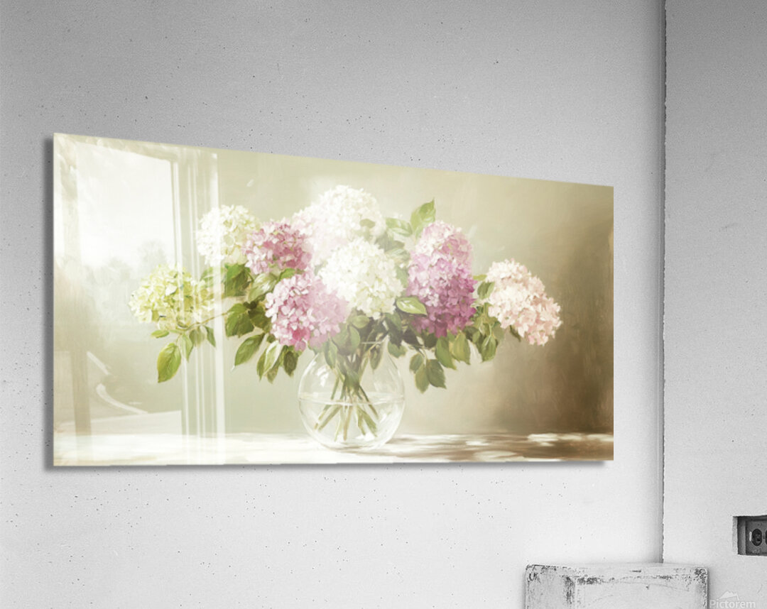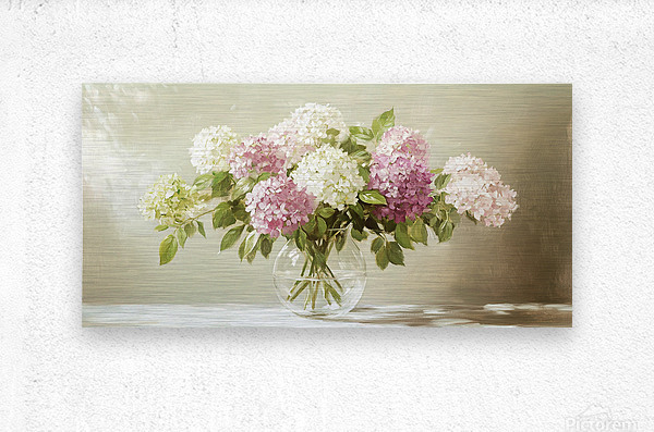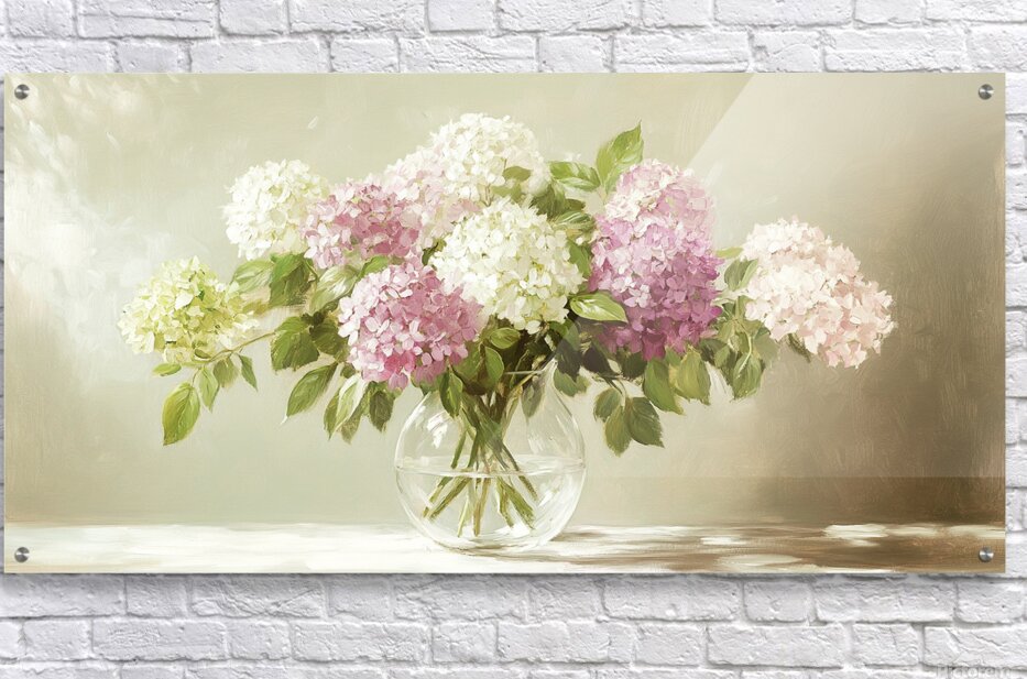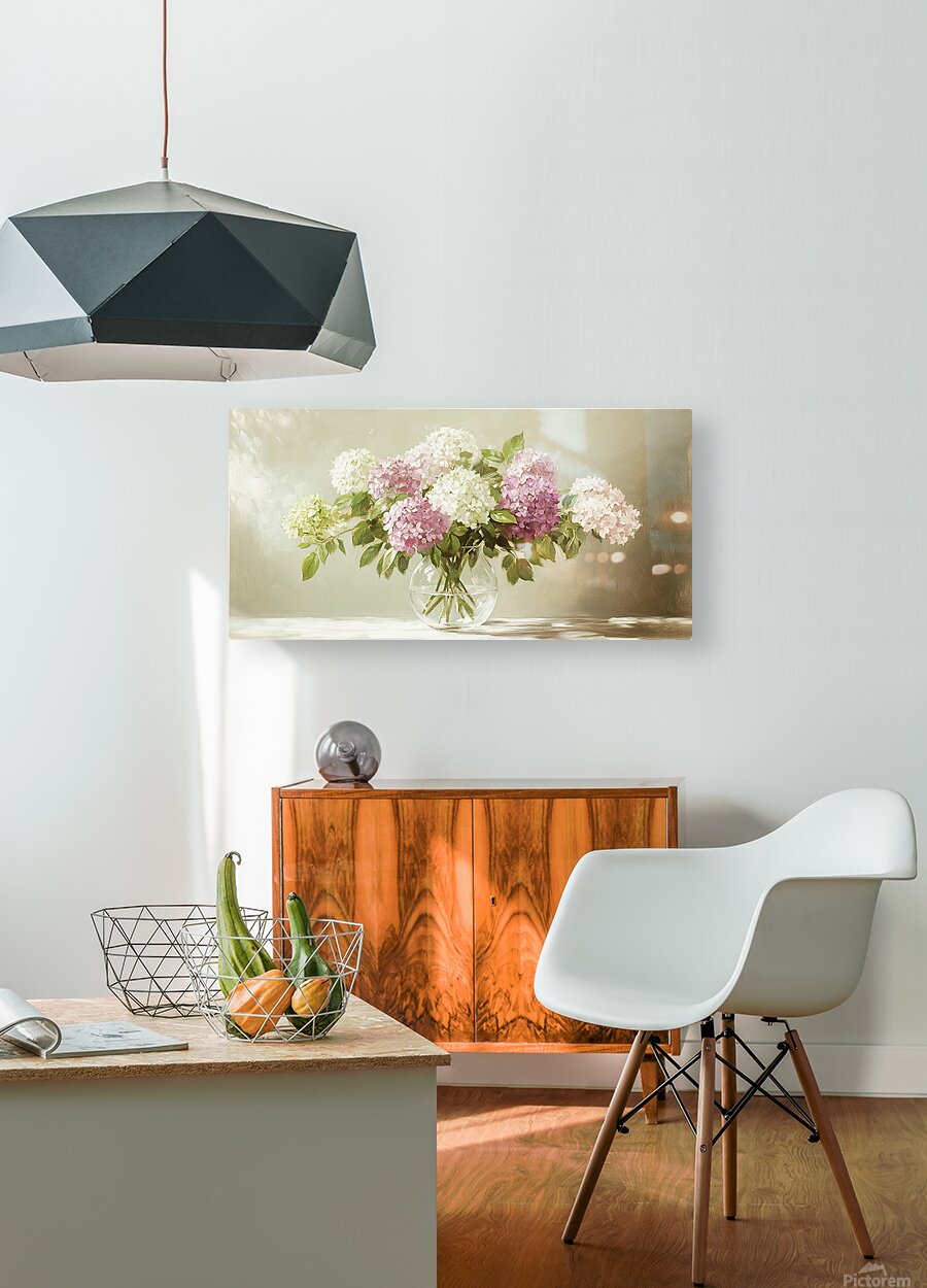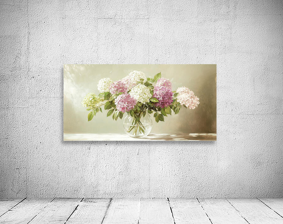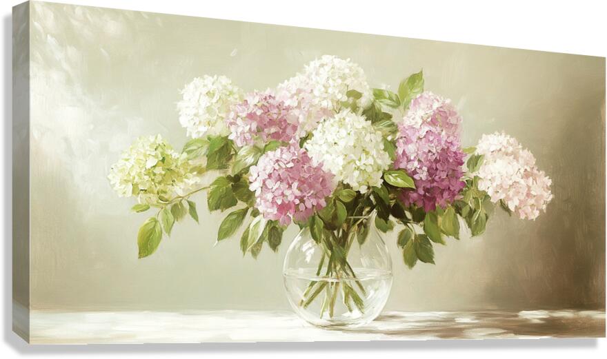 ABOUT THIS ARTWORK: BEAUTIFUL WHITE AND PINK HORTENSIA FLOWERS IN VASE ON TABLE