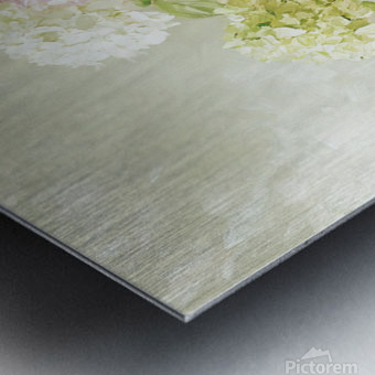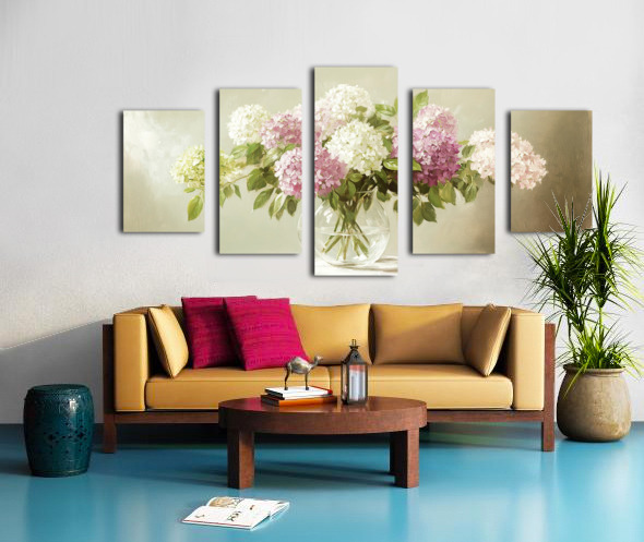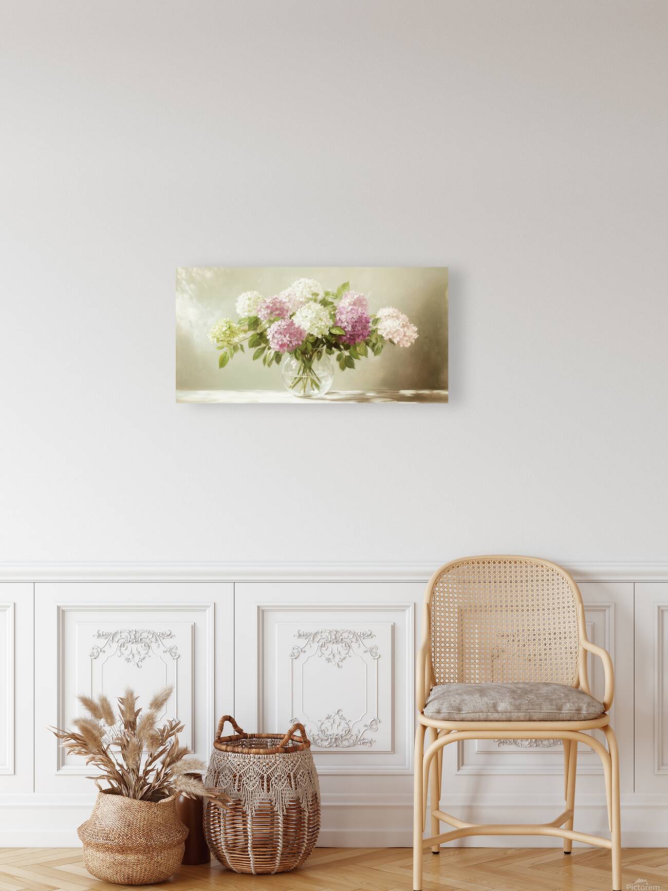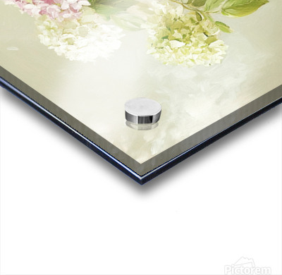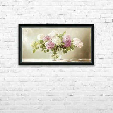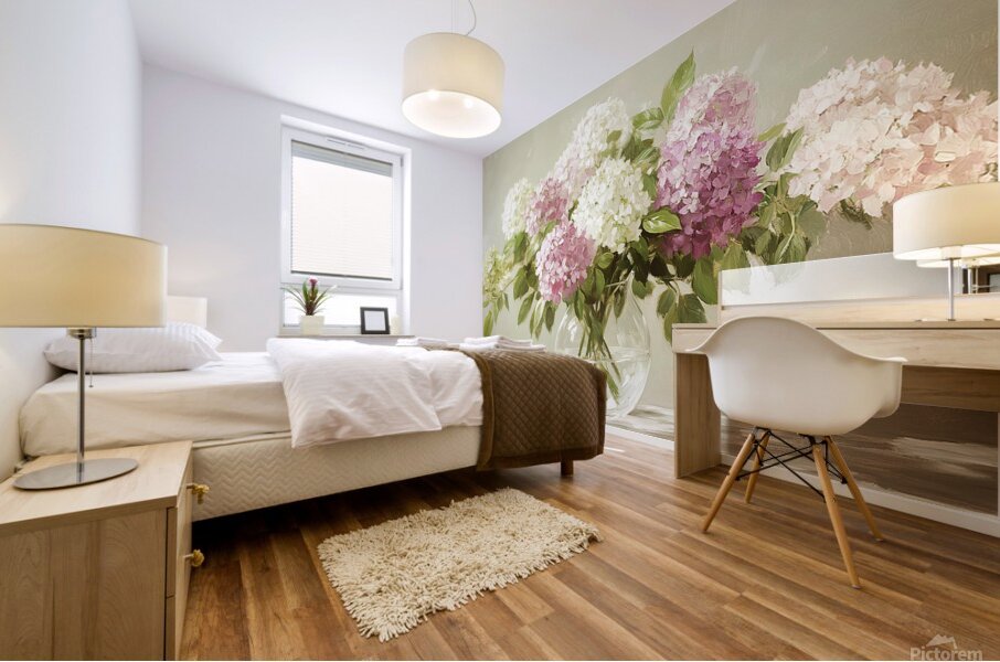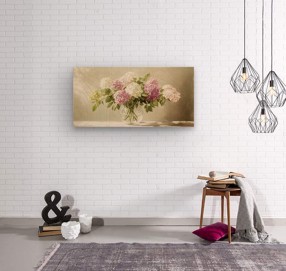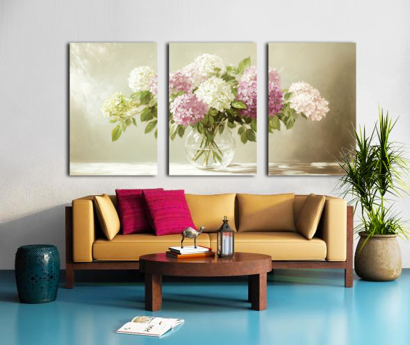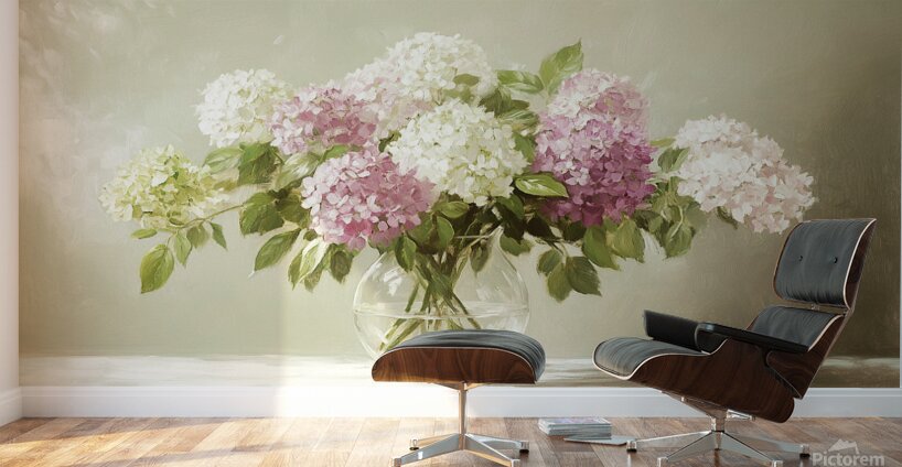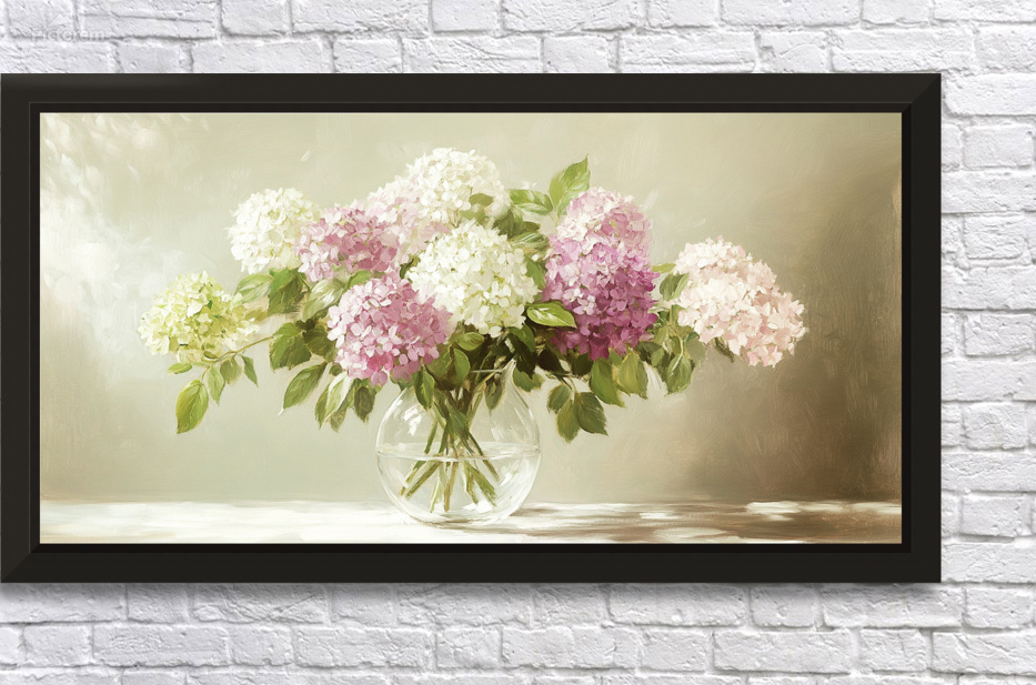 ABOUT THIS ARTWORK: BEAUTIFUL WHITE AND PINK HORTENSIA FLOWERS IN VASE ON TABLE