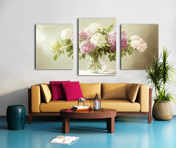 BEAUTIFUL WHITE AND PINK HORTENSIA FLOWERS IN VASE ON TABLE	 VAIVIRGA  Canvas Print