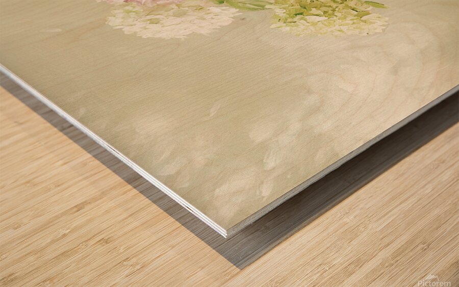 Beautiful white and pink hortensia flowers in vase on table	  Wood print