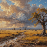 A serene landscape featuring a lone tree beside a winding dirt path. The sky is filled with dramatic clouds showcasing a mix of sunlight and shadow. T...[+]