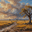 A serene landscape featuring a lone tree beside a winding dirt path. The sky is filled with dramatic clouds showcasing a mix of sunlight and shadow. The foreground is a golden field hinting at a warm sunset.