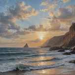 A serene beach scene at sunset featuring gentle waves lapping at the shore rocky formations and dramatic clouds illuminated by the setting sun.
