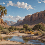 A serene desert landscape featuring palm trees a winding stream and towering cliffs under a blue sky with fluffy clouds.