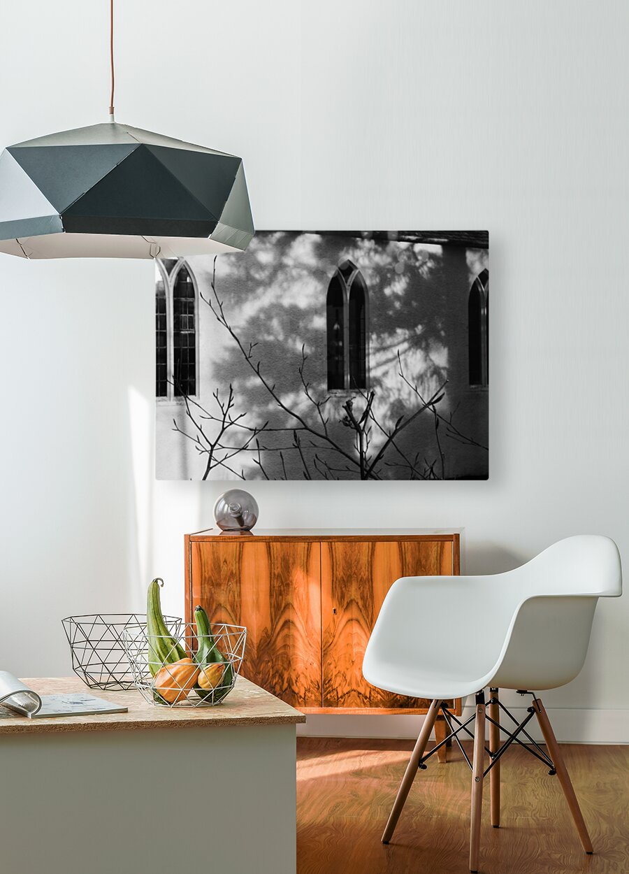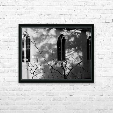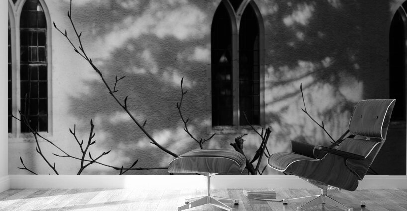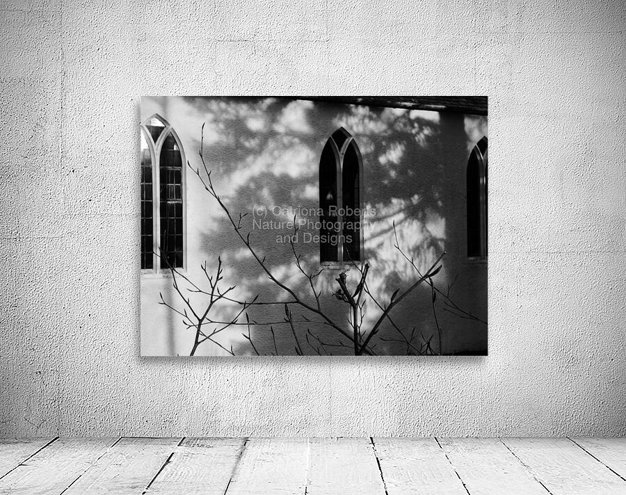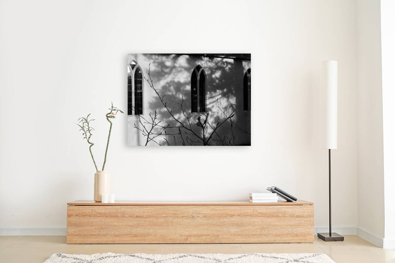 I took this photo during a lovely winter walk in the Scottish Highlands. It features sunlight casting intricate shadows of bare branches against the wall of a building with arched windows. The monochrome scene emphasizes the contrast between light and shadow, creating a serene and contemplative mood.