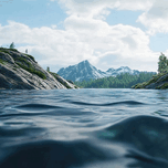 Tranquil alpine lake scene with majestic mountains and clear blue water. Technique: Digital rendering, influenced by Ansel Adams and Albert Bierstadt...[+]