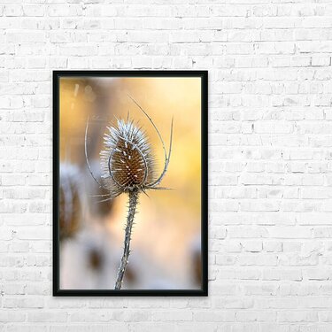 Get this artwork "Closeup macro shot of a thistle flower covered by beautiful ice crystals " in a framed print.