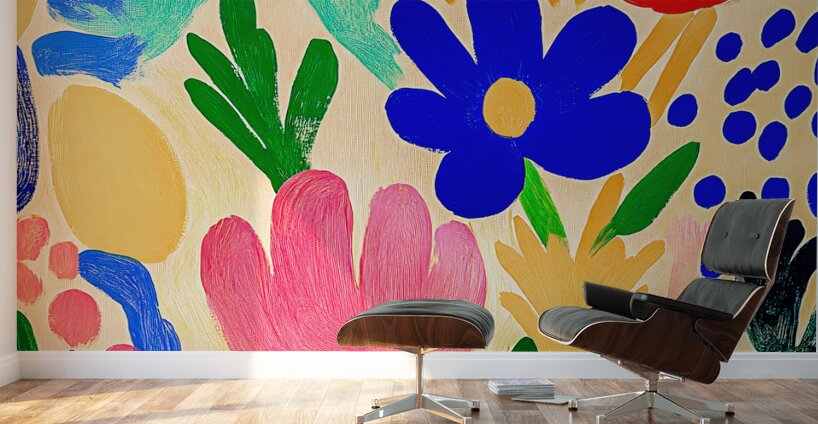 A vibrant composition filled with an array of colorful flowers and leaves creates a lively and cheerful atmosphere. Bold reds blues and greens dominate with abstract shapes adding a playful touch.