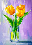 Bright yellow tulips stand elegantly in a clear glass vase contrasting beautifully against a soft purple background. The vibrant green leaves add a re...[+]