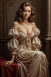 A beautiful woman with long brown hair styled in soft waves sits gracefully in a luxurious off-the-shoulder gown. The gown is a delicate cream color adorned with intricate lace detailing and flowing fabric. The womans gaze is direct and captivating her eyes highlighted by a hint of makeup. She wears a delicate gold necklace and earrings adding a touch of elegance to her ensemble. The backdrop features ornate gold-accented walls creating a sense of grandeur and sophistication. The overall image evokes a timeless and romantic atmosphere capturing the essence of feminine grace and beauty.