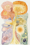 A stylized representation of a tree-like structure with diverse cellular patterns and textures. Technique: Watercolor on paper, influenced by Ernst H...[+]