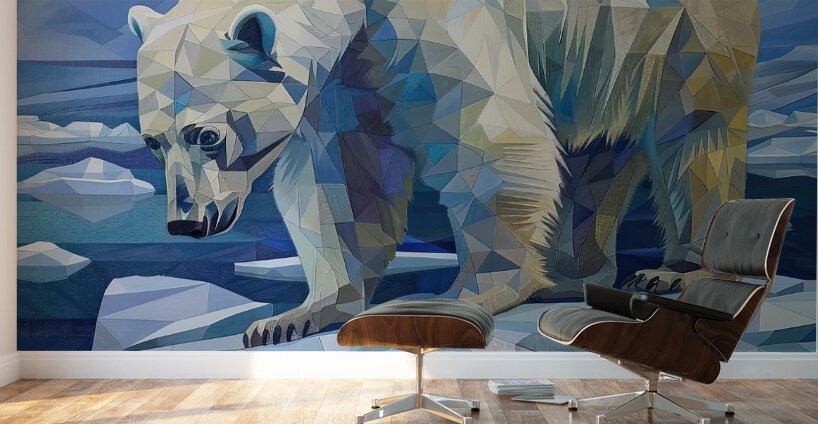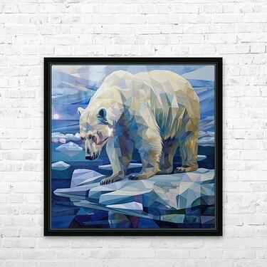 A polar bear rendered in geometric facets stands on ice floes, its gaze fixed on the viewer. Technique: Acrylic on canvas, influenced by Pablo Picasso and Juan Gris Artist's Intent: To convey the fragility of the Arctic ecosystem and the majestic presence of the polar bear through a contemporary lens. Contribution: Strong appeal to collectors interested in wildlife art, geometric abstraction, and contemporary styles. Suitable for galleries and art fairs. Influences: Geometric abstraction applied to wildlife portraiture. Faceted forms create a sense of depth and texture.