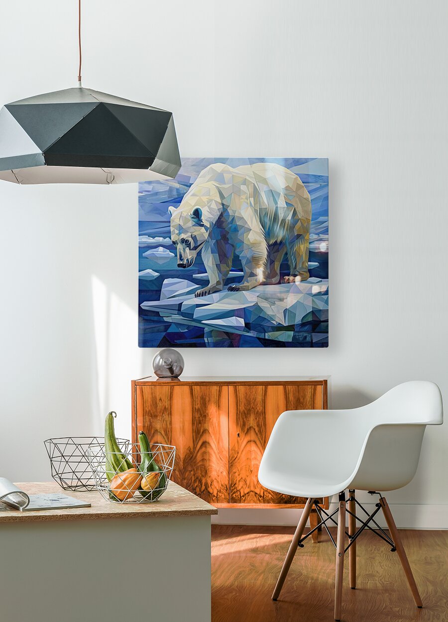 A polar bear rendered in geometric facets stands on ice floes, its gaze fixed on the viewer. Technique: Acrylic on canvas, influenced by Pablo Picass...[+]