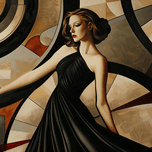 Elegant woman in a black dress posed against a geometric Art Deco background. Technique: Oil on canvas, influenced by Tamara de Lempicka and Erte Ar...[+]