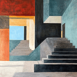 Interlocking architectural spaces with staircases leading to unknown destinations. Technique: Acrylic on canvas, influenced by Giorgio de Chirico and Edward Hopper. Artist's Intent: To evoke a sense of mystery and contemplation about the nature of space and perception. Contribution: Appeals to collectors of modern and contemporary art interested in geometric abstraction, surrealism, and architectural themes. Influences: Precise geometric forms, flat color fields, and subtle light gradations create a sense of stillness and mystery.