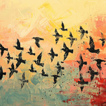 Silhouetted birds ascend against a textured, vibrant sunset sky. Technique: Acrylic on canvas, influenced by Joan Miró and Franz Kline Artist's Intent: Evokes a sense of freedom and movement, capturing the beauty of nature's fleeting moments. Contribution: Appeals to a broad audience with its vibrant colors and dynamic composition. Suitable for both modern and eclectic décor. Influences: Impasto and stenciling techniques create a dynamic interplay of texture and form. The birds appear as silhouettes against a vibrant, textured backdrop.