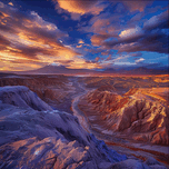A vibrant sunset illuminates a dramatic desert canyon landscape. Technique: Photograph, influenced by Ansel Adams and Galen Rowell Artist's Inte...[+]
