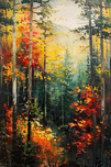 A forest scene in autumn, with vibrant foliage and dappled light. Technique: Oil on canvas, influenced by Vincent van Gogh and Claude Monet. Artist's Intent: To evoke the feeling of a crisp autumn day in a vibrant forest, capturing the beauty of the changing leaves and the warm, dappled light. Contribution: Strong appeal to nature lovers and those seeking vibrant, evocative artwork. Suitable for both residential and commercial spaces. Influences: Impasto technique with visible brushstrokes and vibrant color blending. Emphasis on capturing the interplay of light and shadow within the forest.