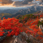 The Great Wall of China winds through a landscape ablaze with autumn foliage under a dramatic sunset sky. Technique: Photograph, influenced by Ansel ...[+]