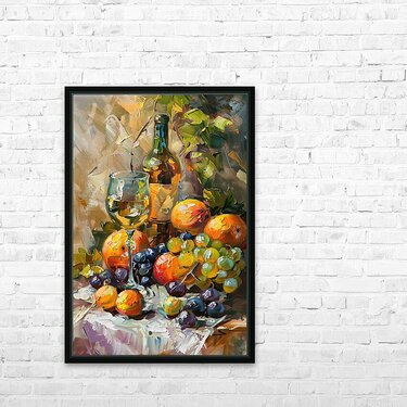 A still life featuring a bottle of wine, a glass, and an assortment of ripe fruits. Technique: Oil on canvas, influenced by Vincent van Gogh and Paul Cézanne Artist's Intent: To capture the abundance and richness of the autumn harvest through a vibrant and textured still life. Contribution: Appeals to traditional art collectors and those seeking vibrant, textured pieces. Suitable for dining rooms, kitchens, or wine cellars. Influences: Impasto technique with visible brushstrokes and vibrant colors. Emphasis on light and shadow play.