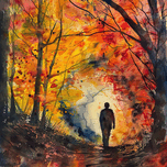 A lone figure walks an autumnal path, bathed in warm, vibrant light. Technique: Watercolor on paper, influenced by Caspar David Friedrich and J.M.W. ...[+]