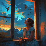 A woman in a simple dress leans on a window sill of an old house, looking up at the evening sky painted in shades of blue and orange. Her face is illuminated by the last light of the sun, reflecting deep emotions—melancholy and hope intertwined. Outside, birds fly freely against the fading daylight. The scene has a painterly, soft-focus style, blending realism with dreamlike aesthetics. Warm ambient lighting, expressive color grading, poetic framing, film-like texture, inspired by Brazilian romanticism --ar