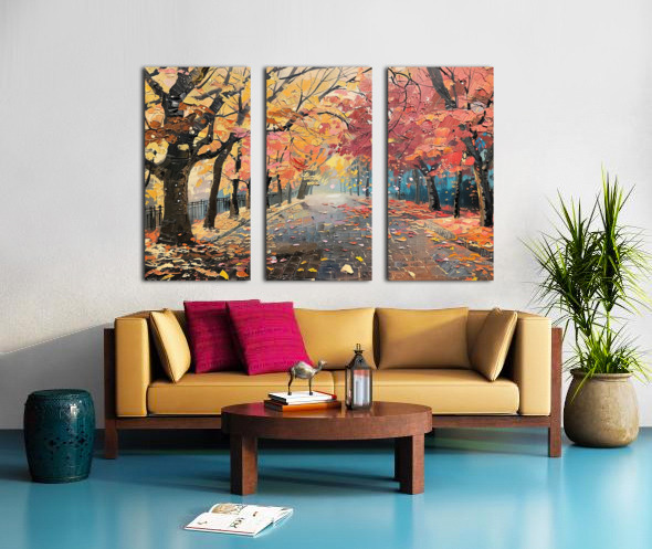 A serene autumn pathway lined with colorful trees, with fallen leaves scattered on the cobblestone ground. Technique: Impasto oil on canvas, influenced by Leonid Afremov and Vincent van Gogh Artist's Intent: To evoke a sense of peaceful contemplation and appreciation for the beauty of autumn. Contribution: Strong market appeal due to the popular autumn theme and the appealing impasto technique. Suitable for home décor, especially in living rooms and dining areas. Influences: Thick impasto strokes create a textured, tactile surface, capturing the vibrancy of autumn foliage. The interplay of light and shadow adds depth and atmosphere.
