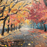 A serene autumn pathway lined with colorful trees, with fallen leaves scattered on the cobblestone ground. Technique: Impasto oil on canvas, influenc...[+]