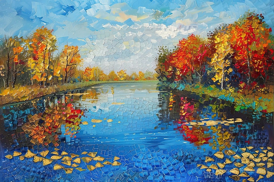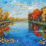 Autumnal lake scene with vibrant colors Technique: Oil on canvas, influenced by Claude Monet and Alfred Sisley Artist's Intent: Capture the beau...[+]