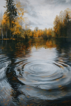Serene autumn landscape reflected in a still pond, disturbed by gentle ripples. Technique: Oil on canvas, influenced by Claude Monet and Winslow Homer. Artist's Intent: To evoke a sense of peace and contemplation through the observation of nature's subtle movements. Contribution: Appeals to collectors interested in contemporary realism, landscape art, and nature-inspired artwork. Strong potential for prints and home décor. Influences: Realistic depiction of water ripples and reflections with detailed brushwork capturing the interplay of light and shadow.