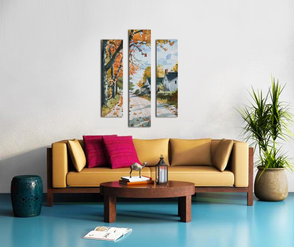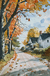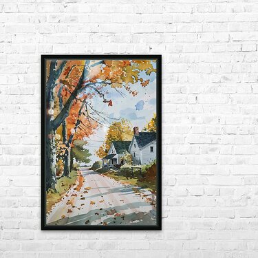 A quiet country road winds past a farmhouse in autumn, leaves scattered across the path. Technique: Watercolor on paper, influenced by Edward Hopper and Andrew Wyeth Artist's Intent: To evoke a sense of peaceful nostalgia and the quiet beauty of the autumn season. Contribution: Appeals to those seeking nostalgic and serene landscapes. Strong potential in print and home décor markets. Influences: Loose, expressive brushwork captures the fleeting light and color of autumn. The artist uses washes and dry brush techniques to create a sense of depth and atmosphere.