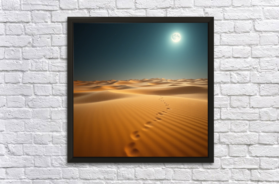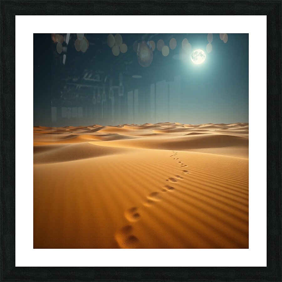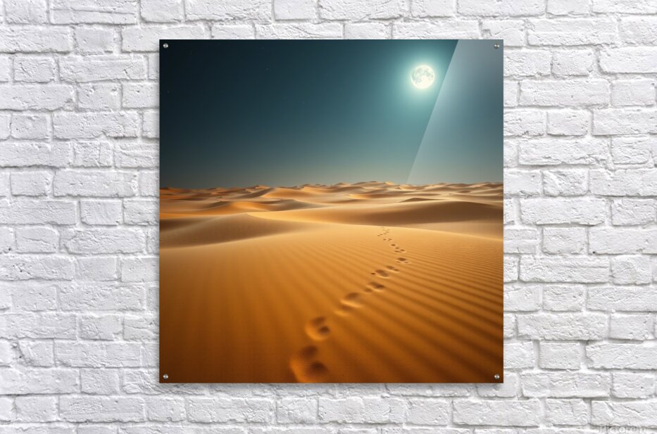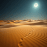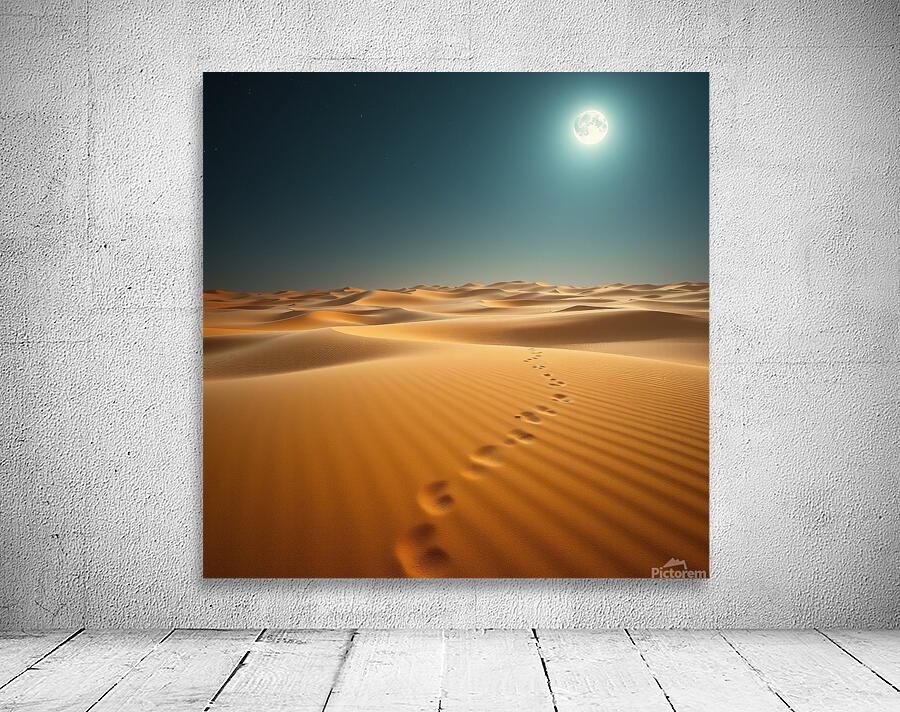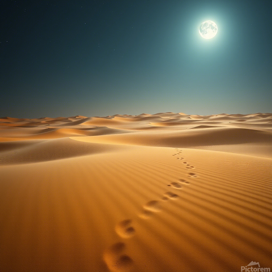 This mesmerizing image captures the ethereal beauty of a desert landscape under a full moon. The moon's radiant glow illuminates the undulating sand dunes, casting long shadows and highlighting their textures. A set of footprints leads into the distance, inviting the viewer to imagine a journey through this tranquil yet awe-inspiring landscape. The starry sky adds a touch of celestial wonder to the scene, creating a sense of peace and serenity