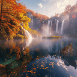A mesmerizing waterfall cascades into a crystal-clear pool, surrounded by vibrant autumn foliage. Technique: Photography, influenced by Ansel Adams a...[+]