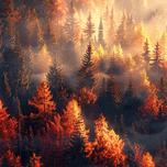 Aerial view of a misty autumn forest bathed in golden sunlight. Technique: Digital rendering, influenced by Ansel Adams and Albert Bierstadt. Artist...[+]