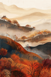 Misty autumn landscape with rolling hills and colorful foliage. A sense of tranquility and natural beauty pervades. Technique: Digital painting, influenced by Caspar David Friedrich and Hiroshige Utagawa. Artist's Intent: To evoke a sense of peaceful contemplation and appreciation for the beauty of the natural world during autumn. Contribution: Appeals to a broad audience with its serene and evocative autumnal theme. Suitable for both residential and commercial spaces. Influences: Layered digital painting technique with textured brushstrokes and atmospheric perspective. Color gradients enhance depth and mood.