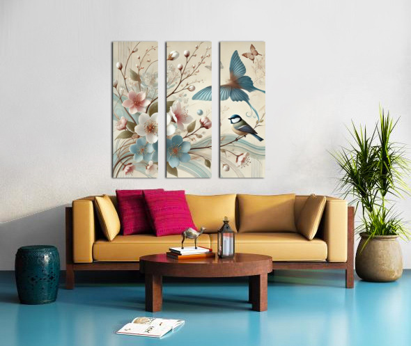 A serene and artistic illustration inspired by nature, featuring delicate butterflies, elegant birds, and blooming branches. The artwork is designed in a soft, calming style with pastel tones, creating a peaceful and elegant aesthetic. Perfect for nature lovers and artistic decor.