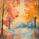 Abstract autumn landscape with vibrant colors and dreamlike atmosphere. Technique: Watercolor on paper, influenced by Paul Klee and Emil Nolde Artist's Intent: To evoke the tranquil yet vibrant feeling of an autumn forest bathed in golden light. Contribution: Appeals to collectors of contemporary landscape and nature-inspired art. Strong decorative potential. Influences: Layered washes and dry brush technique create a textured, dreamlike effect. Spattering adds depth.