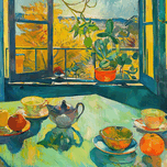 Still life on a table by an open window, bathed in autumnal light. Technique: Oil on canvas, influenced by Pierre Bonnard and Henri Matisse. Artist&...[+]