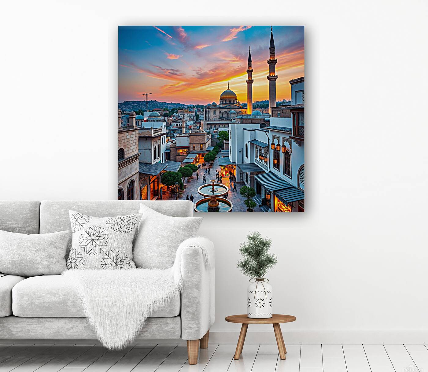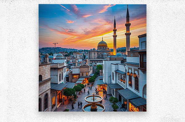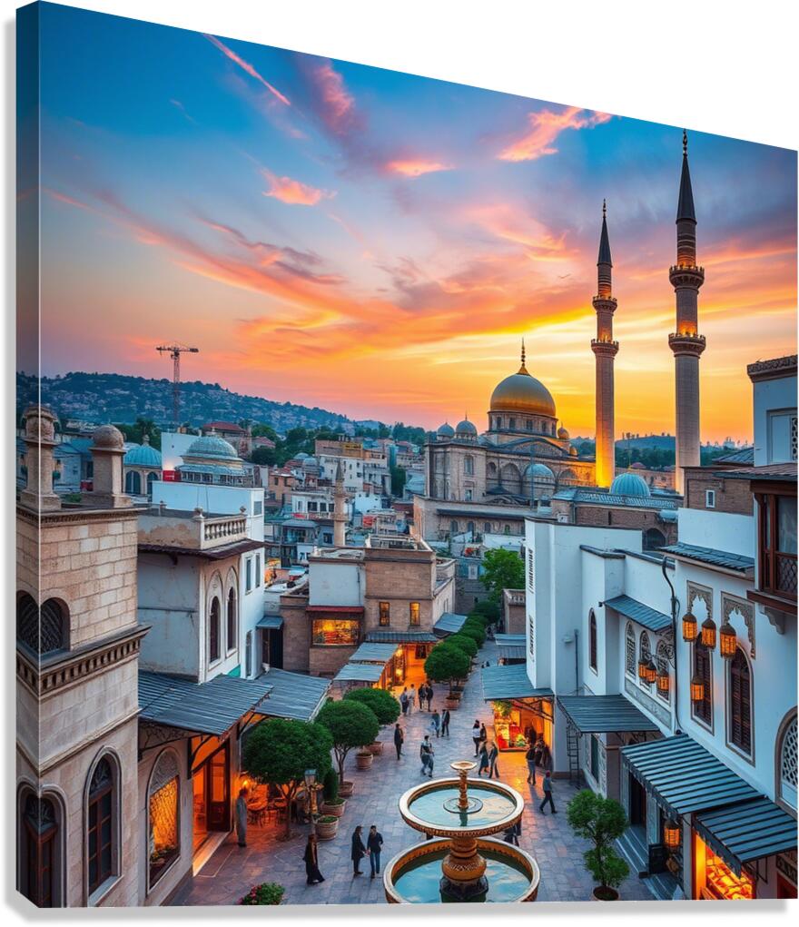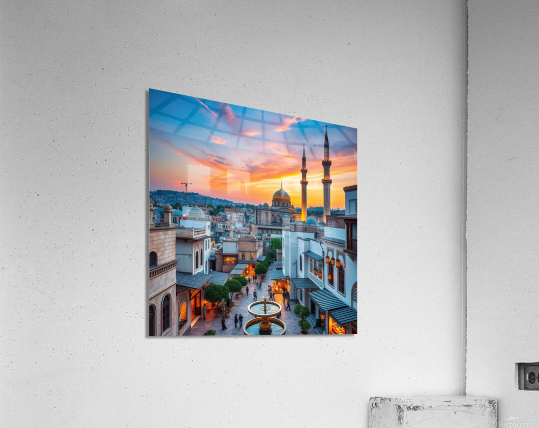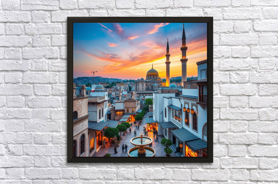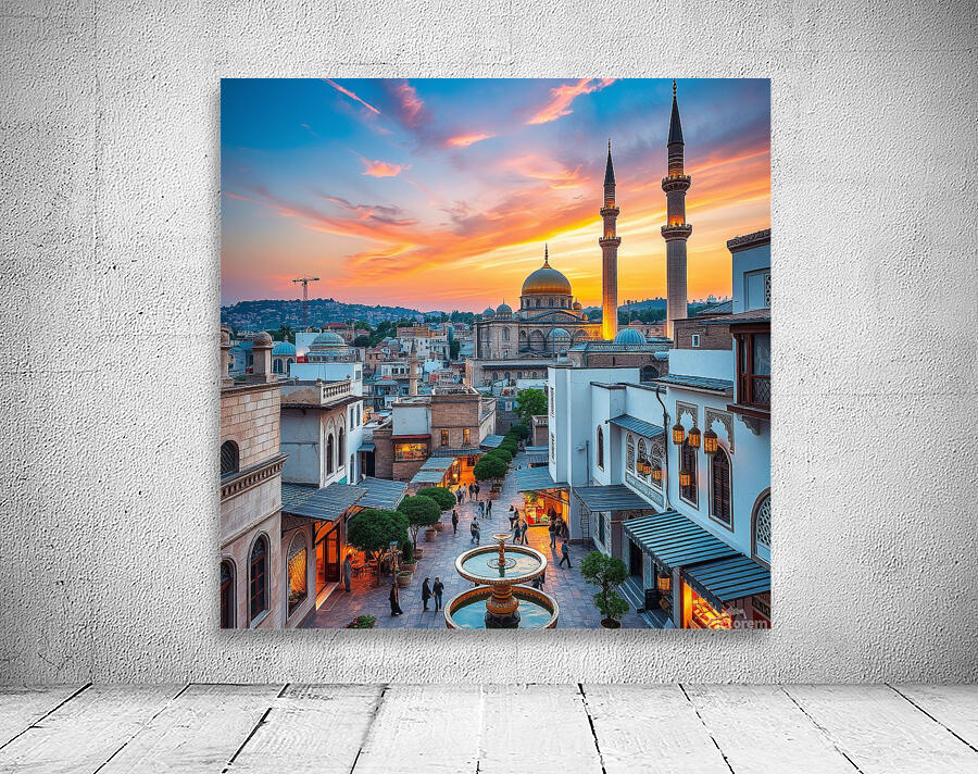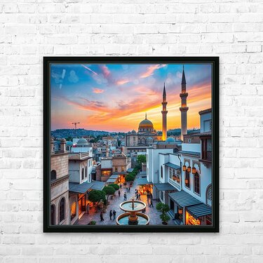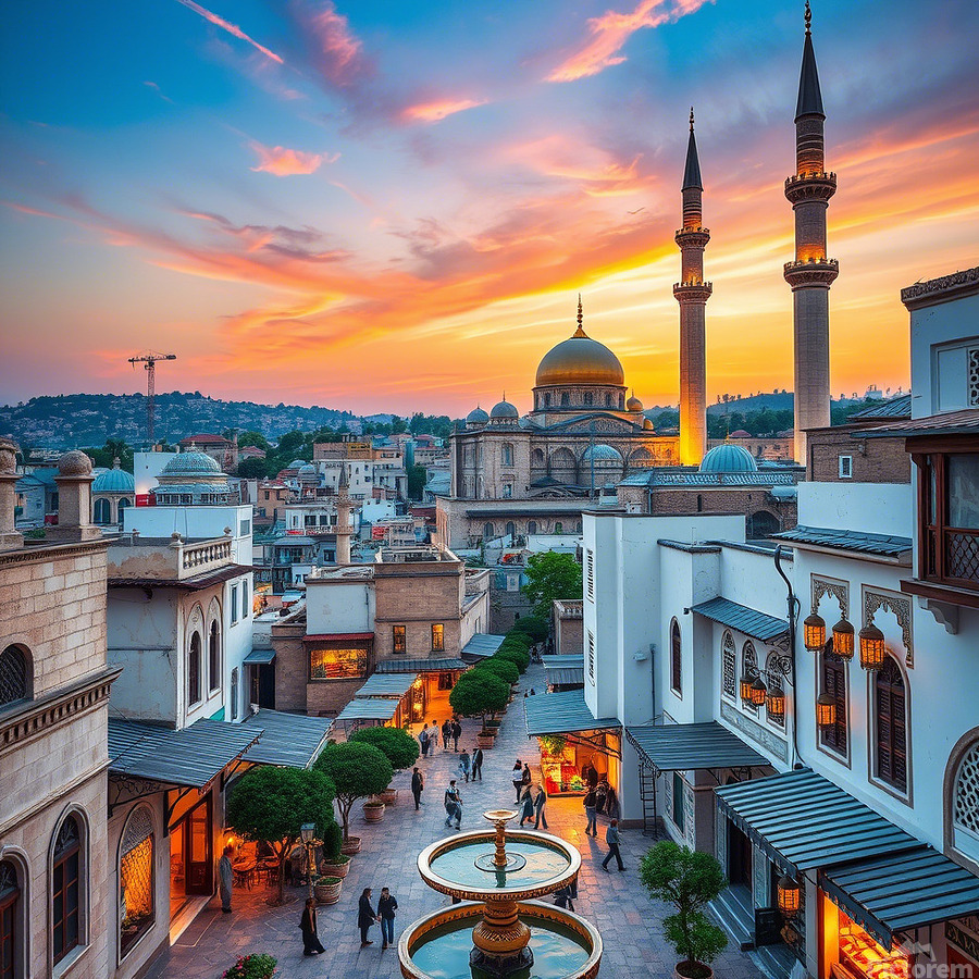 This captivating image showcases a beautiful cityscape at sunset, featuring a prominent mosque with a golden dome and towering minarets. The warm glow of the setting sun bathes the city in a golden light, creating a mesmerizing spectacle. The mosque's intricate architecture and the surrounding buildings blend seamlessly, showcasing a harmonious mix of traditional and modern elements. People can be seen strolling around the square, adding a touch of life and activity to the scene. The overall composition evokes a sense of peace, tranquility, and the rich cultural heritage of the city