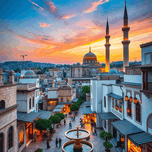 This captivating image showcases a beautiful cityscape at sunset, featuring a prominent mosque with a golden dome and towering minarets. The warm glow...[+]