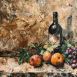 A still life featuring wine, grapes, and apples on a textured surface. Technique: Oil on canvas, influenced by Paul Cézanne and Giorgio Morandi Artist's Intent: To capture the essence of autumn's bounty and the simple beauty of everyday objects. Contribution: Appeals to collectors of traditional and contemporary still life paintings. Offers a touch of classic charm with a modern twist. Influences: Impasto technique with visible brushstrokes and textured layering. Realistic depiction of objects with an emphasis on form and light.
