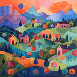 Rolling hills dotted with colorful houses under a vibrant sunset sky. Technique: Acrylic on canvas, influenced by Henri Matisse and Grant Wood Artis...[+]