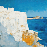 White cliffside overlooking a deep blue sea, with a distant headland under a clear sky. Technique: Oil on canvas, influenced by Paul Cézanne and Claude Monet. Artist's Intent: To evoke the serene yet powerful atmosphere of a Mediterranean coastal scene. Contribution: Appeals to collectors of contemporary landscapes and seascapes, particularly those drawn to impressionistic and expressionistic styles. Influences: Impasto strokes create textured surfaces, capturing the interplay of light and shadow on the cliff face and the vibrant hues of the sea.