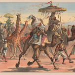 Circus troupe with people in exotic dress riding camels giraffes elephants by Calvert Litho. Co