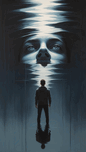 "Ego's Reflection" "Illustrate a figure standing before a dark, reflective water surface, gazing at their own reflection. The reflection should appear warped, showing an exaggerated, darker version of themselves, representing the negative traits of the ego like pride and defensiveness. The original figure should be painted in lighter, more muted colors, while the reflection is painted with darker, intense tones to emphasize the contrast between who we are and how the ego distorts our view."